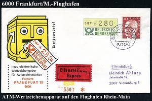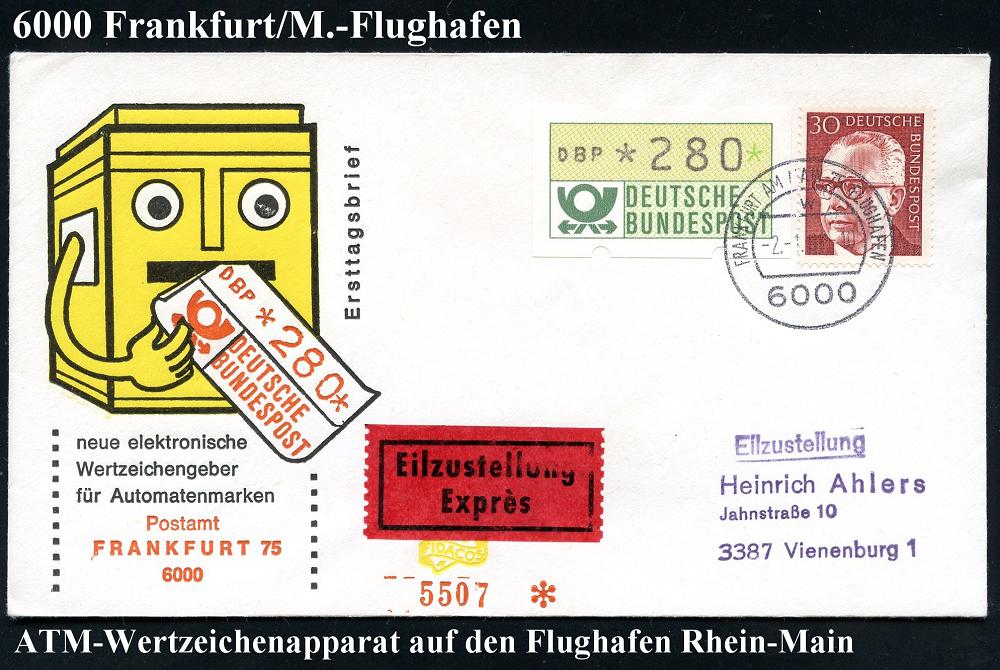 250 | 10 € | 6 Frankfurt/M. Flughafen Rhein-Main : 6000 FRANKFURT AM MAIN 75 FLUGHAFEN/ w 1981 (2.1.) 1K auf ATM 280 Pf. + 30 Pf. Heinemann, Inl.- Eil-FDC-SU (Mi.1) | ![]() | |