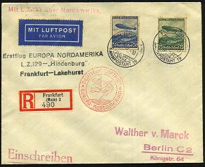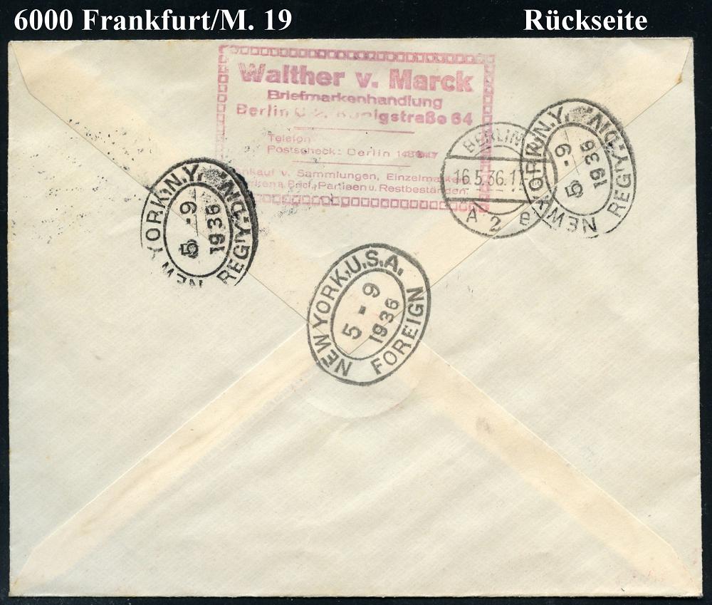 204 | 30 € | 6 Frankfurt/M. Flughafen Rhein-Main : FRANKFURT (MAIN)/ c/ AUSLANDS-/ STELLE/ BAHNPOSTAMT 19 1936 (3.5.) 2K-Steg auf kompl. Zepp.-Satz + 40 Pf. "10 Jahre DLH"= 1. NA-Fahrt LZ 129 (Mi.603, 606/07, + 22.-EUR) + RZ: Frankfurt/(Main) 2 + roter Zepp.-HdN = 1. NA-Fahrt LZ 129 etc.,das Luftschiff wurde am 8. Mai 1937 beim Absturz in Lakehurst vernichtet, Zepp.-R-Bf. n. New York, rs. AS (Mi.12 a, Sie.406 D) | ![]() ![]() | |
