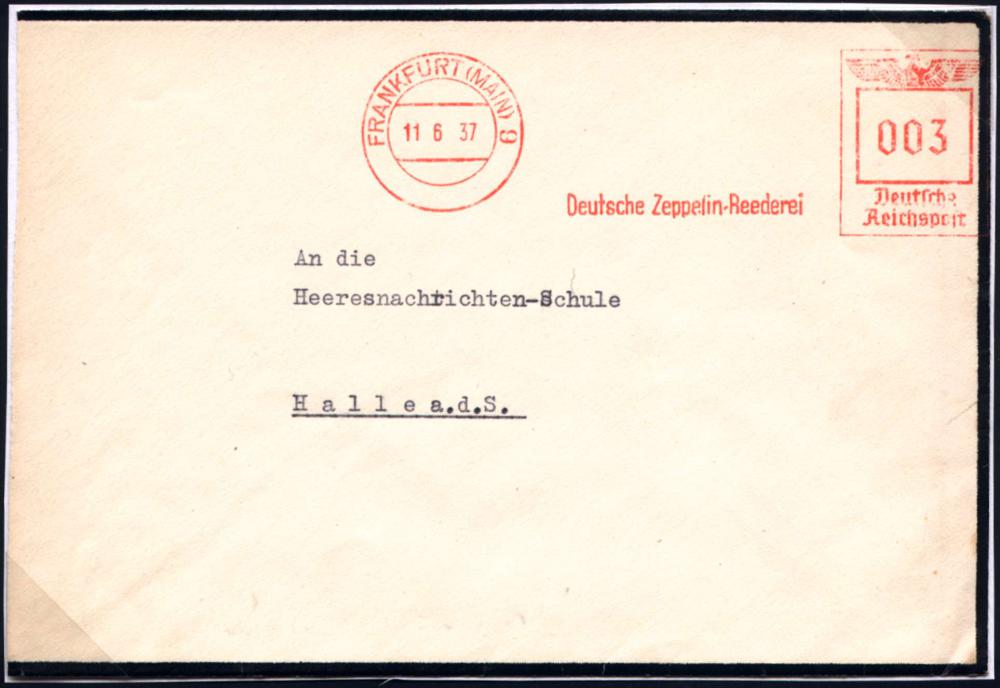 206 | 50 € | 6 Frankfurt/M. Flughafen Rhein-Main : FRANKFURT (MAIN)9/ Deutsche Zeppelin-Reederei 1937 (11.6.) AFS 003 Pf. postamtl. unzulässig auf Trauerbf. = aus der Zeit des L a k e h u r s t - Unglücks (links etw. verkürzt) rs. schw. Ziervordruck der Zeppelin-Reederei (o.Inhalt) an d.Heeres-Nachrichten-Schule, Halle/S., seltener Beleg (Dü.E-5CGo) | ![]() | |