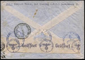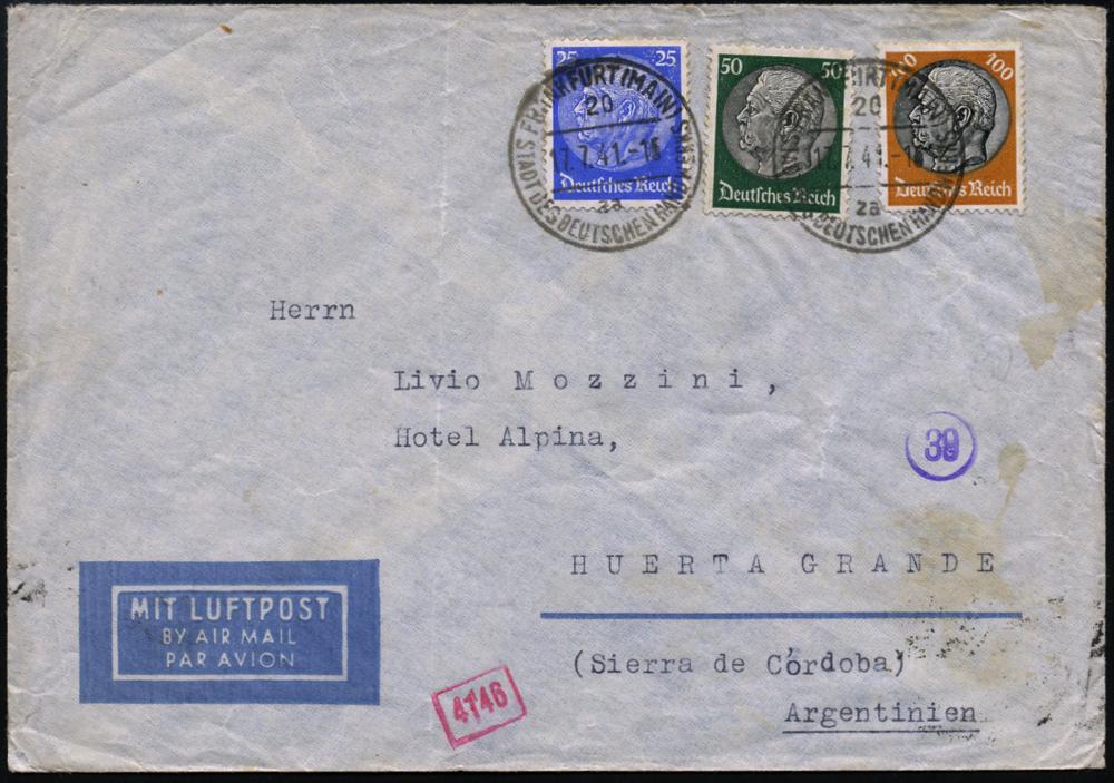 207 | 28 € | 6 Frankfurt/M. Flughafen Rhein-Main : FRANKFURT (MAIN)/ 20/ za/ SDDH 1941 (17.7.) 1K-HWSt auf Drei-Farben-Frankatur Hindenbg. 25, 50 u. 100 Pf. = 175 Pf. (Mi.522, 525, 528) + rs. OKW-Zensur-Streifen "d" + bl. 1K = München (Bf. schwache Mittelfalte), befördert via Rom (LATI), da ab August 1939 deutscher Katapultdienst eingestellt!, italienische Luftpost n. Argentinien (rs. AS: HUERTA GRANDE) | ![]() ![]() | |