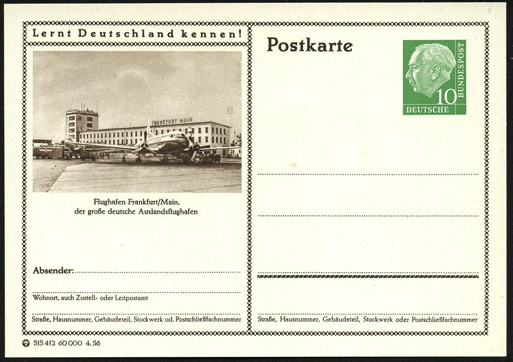 209 | 10 € | 6 Frankfurt/M. Flughafen Rhein-Main : Frankfurt/ Main 1956/59 2 verschied. BiP 10 Pf. Heuss I , III: altes bzw. neues Terminal , je ungebr. (Einzelverkauf möglich: je 6.- EUR) 2 Belege (Mi.P 24, P 41) | ![]() ![]() | |