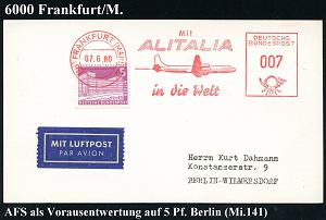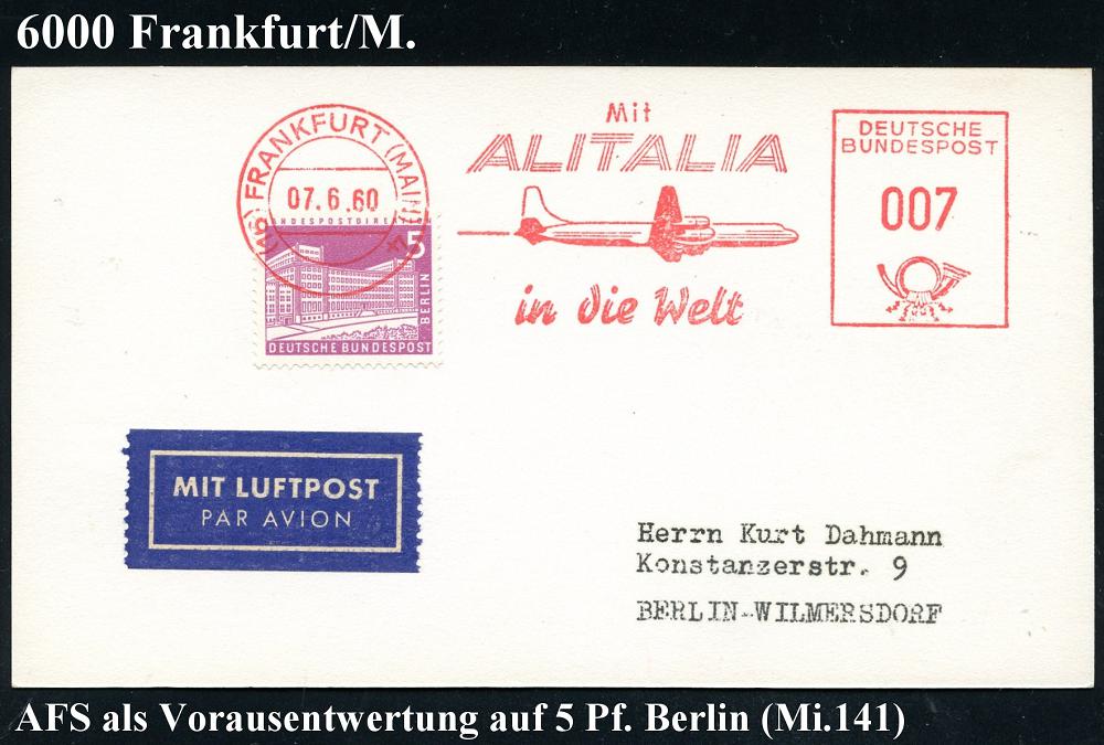 214 | 15 € | 6 Frankfurt/M. Flughafen Rhein-Main : (16) FRANKFURT (MAIN)4/ Mit/ ALITALIA/ in die Welt 1960 (7.6.) AFS 007 Pf. auf 5 Pf.Berlin als VE = 12 Pf. (Mi.141) portorichtige Inl-Flp.-Drs., seltenes Porto! (Dü.E-23CO) | ![]() | |