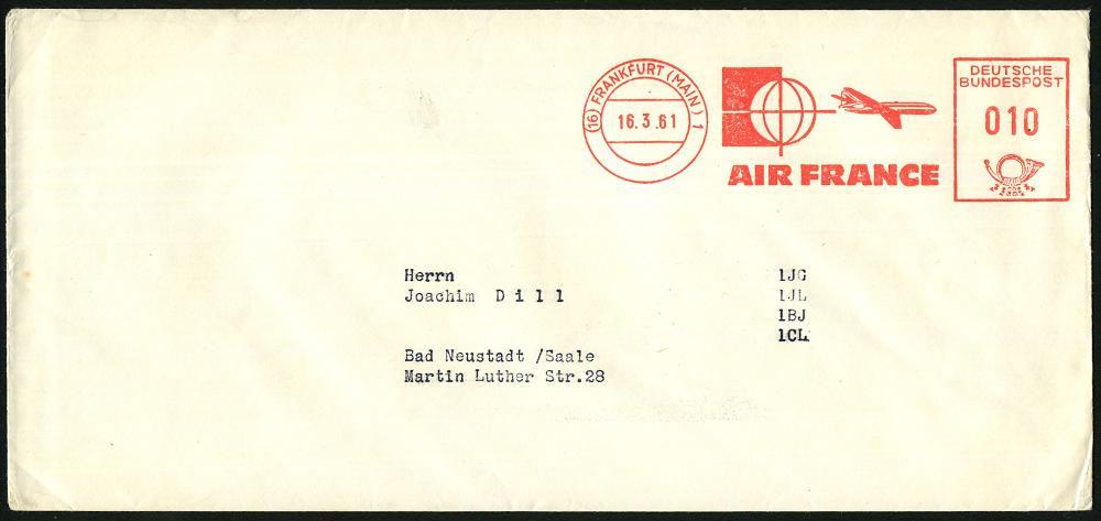215 | 11 € | 6 Frankfurt/M. Flughafen Rhein-Main : (16) FRANKFURT (MAIN) 1/ AIR FRANCE 1961 (16.3.) AFS = Flugzeug "Caravelle" (u. stilis. Globus, Jet) Inl.-Bf. (Dü.E-23) | ![]() | |