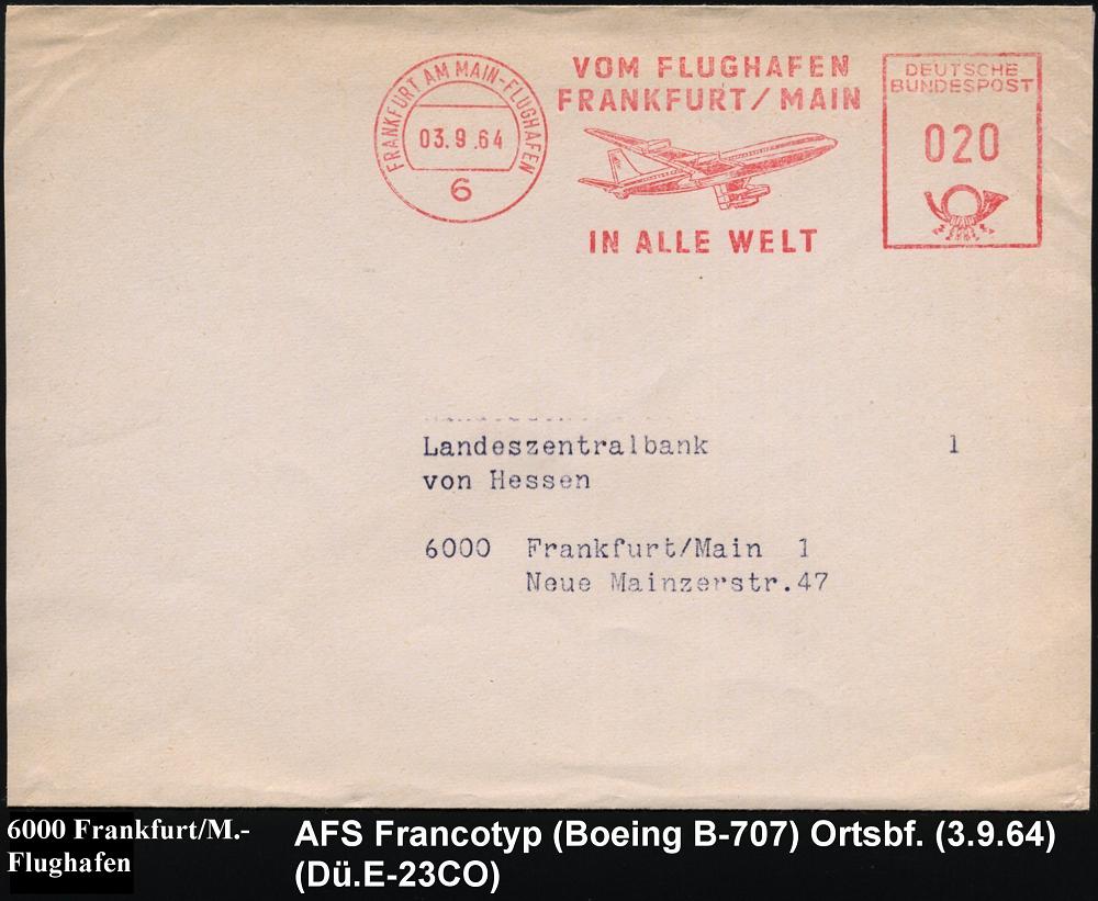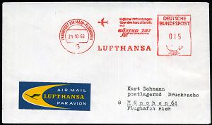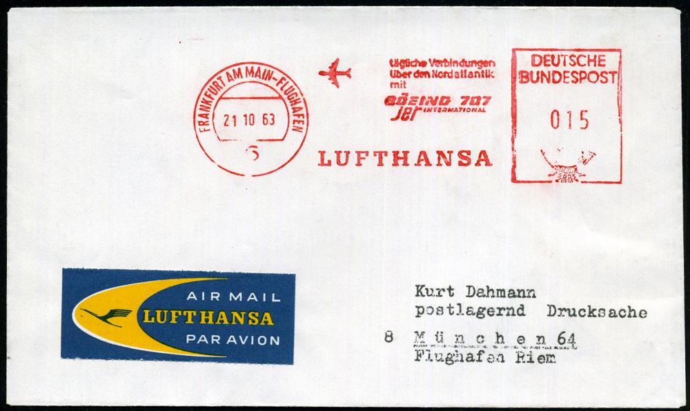 221 | 12 € | 6 Frankfurt/M. Flughafen Rhein-Main : 6 FRANKFURT AM MAIN-FLUGHAFEN/ tägl.Verbingdungen/ über den Nordatlantik/ mit/ BOEING 707/ Jet/ LUFTHANSA 1963 (21.10.) AFS 015 Pf. + DLH-Luftpost-Label , portorichtige Inl.-Flp.-Drs. (Dü.E-23B) | ![]() | |