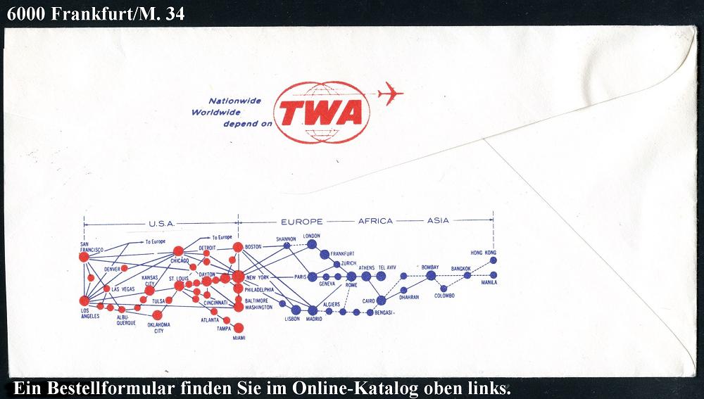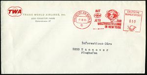 224 | 15 € | 6 Frankfurt/M. Flughafen Rhein-Main : 6 FRANKFURT AM MAIN 34/ MIT/ TWA/ JETS ZUR/ WELTAUSSTELLUNG/ IN NEW YORK 1965 (6.10.) seltener AFS zur Expo (Globus, Logo) klar auf TWA-Reklame-Bf. (links gering verkürzt) rs. Flugstrecken, (Dü.E-23 B) | ![]() ![]() | |