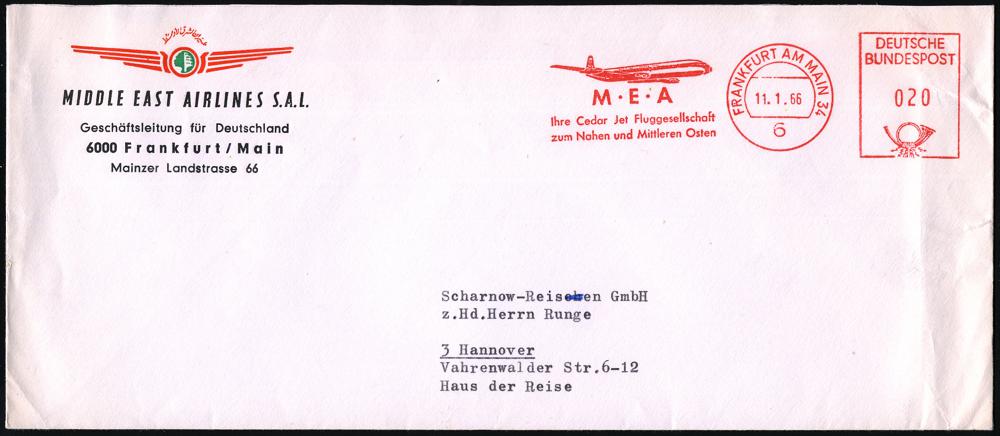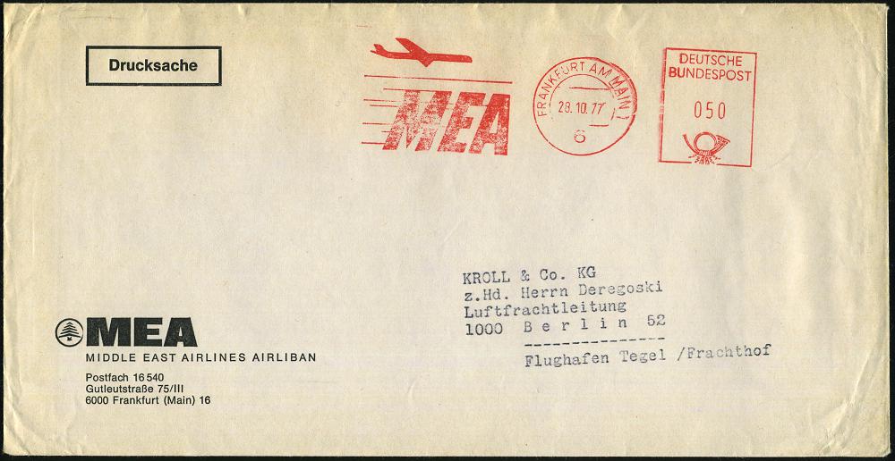 243 | 10 € | 6 Frankfurt/M. Flughafen Rhein-Main : 6 FRANKFURT AM MAIN 1/ M E A 1977 (28.10.) AFS (Jet) Firmen-Bf.: MEA MIDDLE EAST AIRLINES AIRLIBAN (Logo) Inl.-Bf. (Dü.E-26B) | ![]() | |