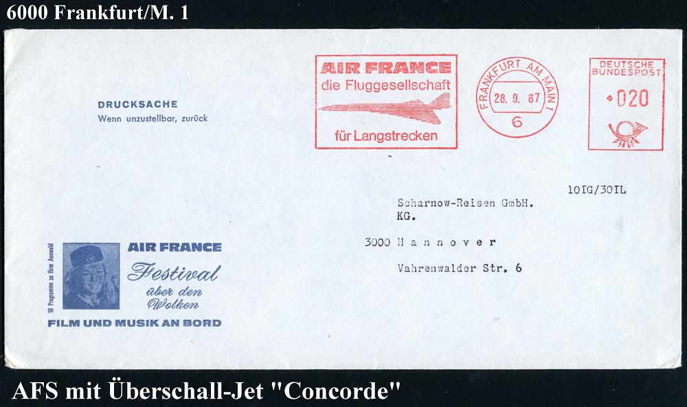 229 | 15 € | 6 Frankfurt/M. Flughafen Rhein-Main : 6 FRANKFURT AM MAIN 1/ AIR FRANCE/ die Fluggesellschaft/ für Langstrecken 1969 (28.9.) AFS = Concorde-Silhouette , dekorat. AIR FRANCE-Reklame-Bf.: Festival über den Wolken/ FILM U.MUSIK AN BORD (Stewardess) Inl.-Bf. (Dü.E-26) | ![]() ![]() | |