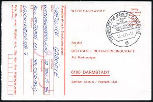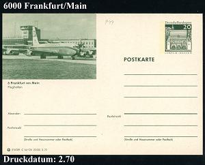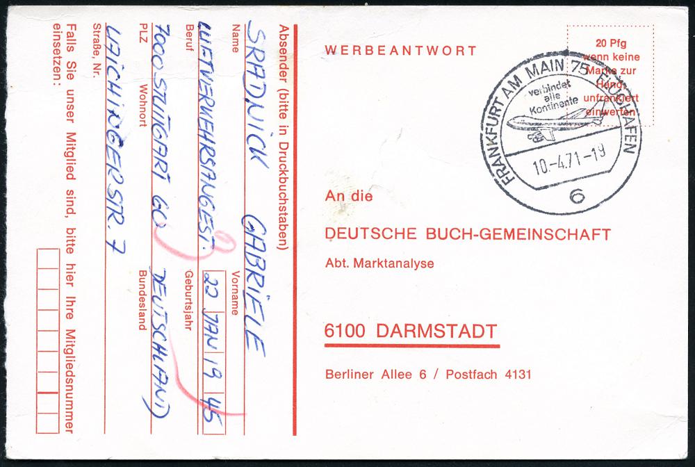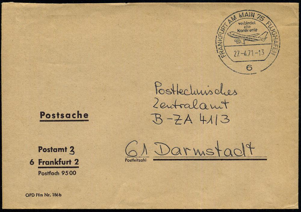 234 | 10 € | 6 Frankfurt/M. Flughafen Rhein-Main : 6 FRANKFURT AM MAIN 75 FLUGHAFEN/ verbindet/ alle/ Kontinente 1971 (27.4.) HWSt = Jumbo-Jet auf Post-Dienst-Bf.: Postamt 3, 6 Frankfurt 2 an PTZ Darmstadt (Bo.547) | ![]() | |