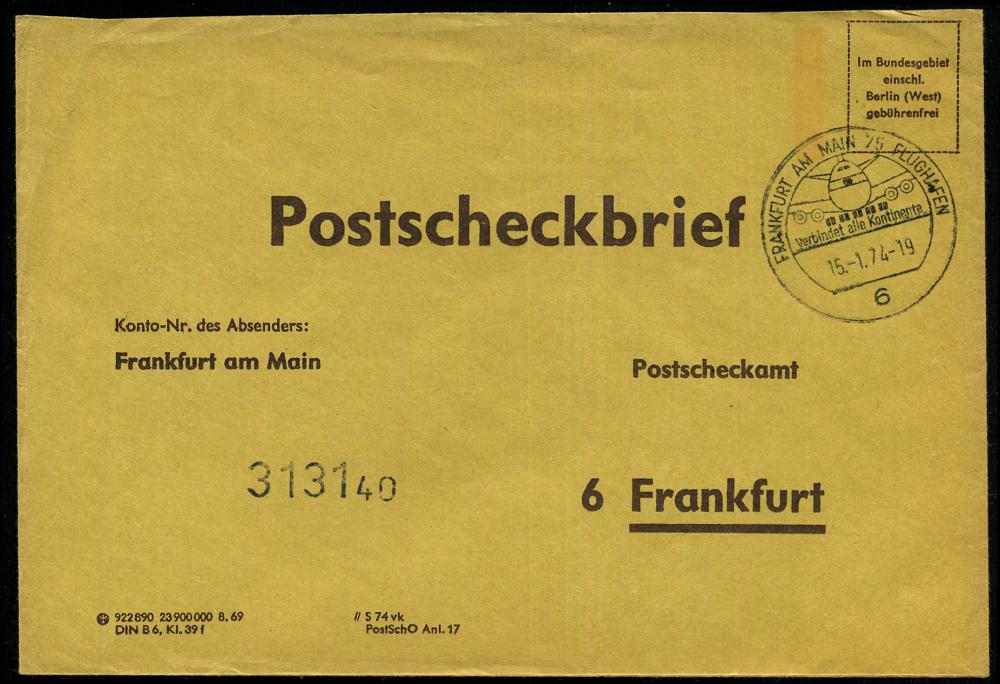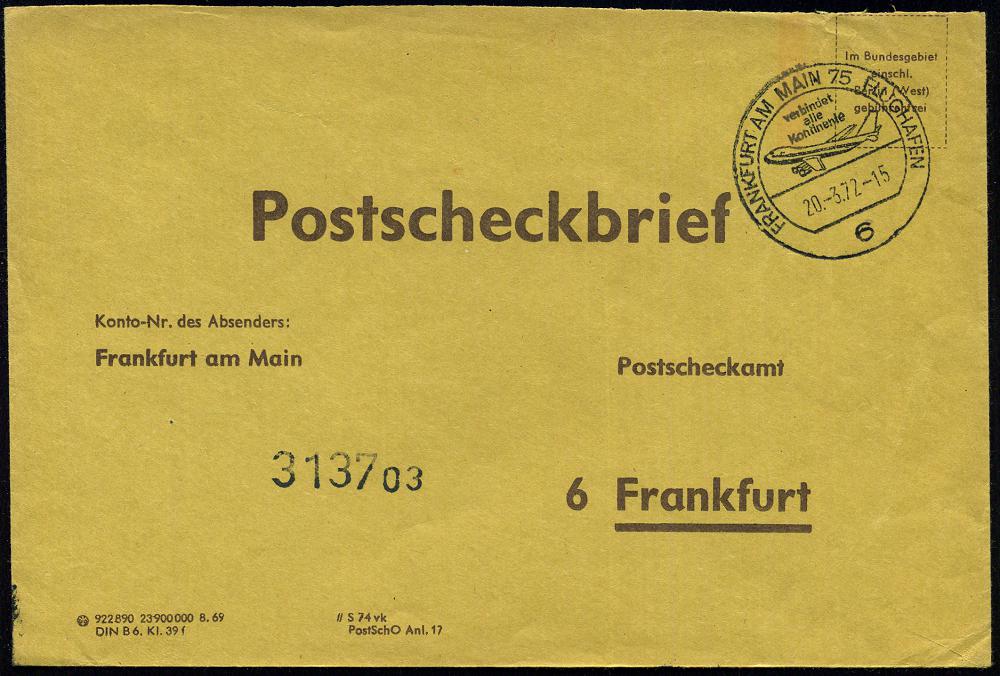 235 | 14 € | 6 Frankfurt/M. Flughafen Rhein-Main : 6 FRANKFURT AM MAIN 75 FLUGHAFEN/ verbindet/ alle/ Kontinente 1972 (20.3.) HWSt = Jumbo-Jet klar auf portofreiem, gelben Postscheck-Bf., seltene Verwendung! (Bo.547) | ![]() | |