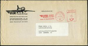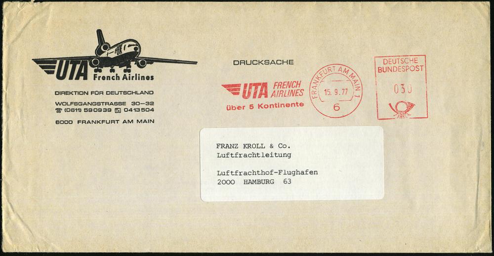 240 | 10 € | 6 Frankfurt/M. Flughafen Rhein-Main : 6 FRANKFURT AM MAIN 1/ UTA/ FRENCH/ AIRLINES/ über 5 Kontinente 1977 (15.9.) AFS auf Reklame-Bf.: UTA.. (Tristar-Jet) Inl.-Bf. (Dü.E-26B) | ![]() | |