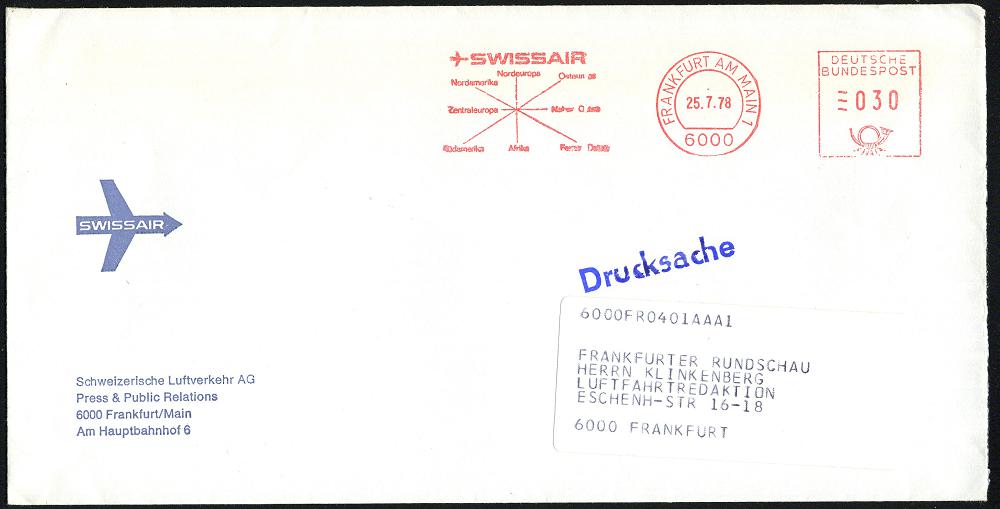 246 | 10 € | 6 Frankfurt/M. Flughafen Rhein-Main : 6000 FRANKFURT AM MAIN 1/ SWISSAIR.. 1984 (25.7.) AFS (= stilis. Streckennetz) zweifarb. Firmen-Bf. mit Logo | ![]() | |