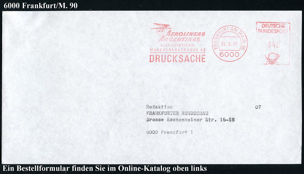 251 | 8 € | 6 Frankfurt/M. Flughafen Rhein-Main : 6000 FRANKFURT AM MAIN 90/ AA/ AEROLINAS/ ARGENTINAS.. 1981 (24.9.) AFS (Logo: stilis.Condor) Ortsbf. (Dü.E-26) | ![]() | |
