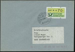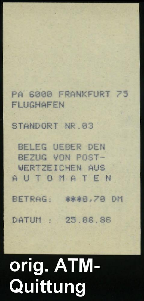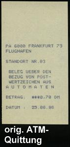 252 | 12 € | 6 Frankfurt/M. Flughafen Rhein-Main : 6000 FRANKFURT AM MAIN 75 FLUGHAFEN/ ab 1986 (25.6.) 1K a. EF 70 Pf. ATM + ATM-Quittung + rosa Linearcode auf portorichtiger Inl.-Brief-Drs., 2 Belege kompl.! | ![]() ![]() | |