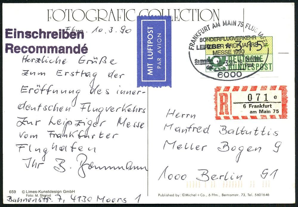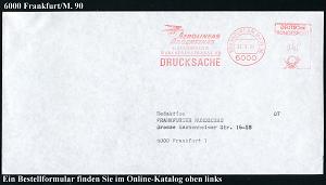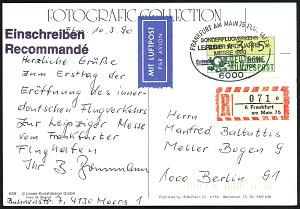 254 | 15 € | 6 Frankfurt/M. Flughafen Rhein-Main : 6000 FRANKFURT AM MAIN 75 FLUGHAFEN/ SONDERLUFTVERKEHR/ LEIPZIGER FRÜHJAHRS/ MESSE.. 1990 (10.3.) SSt auf ATM 315 Pf. EF + alter RZ: 6 Frankfurt/am Main 75/e , klar gest., codierter Inl.-Flp.-Ak.: Airport Frankfurt n. Berlin (Mi.1) | ![]() ![]() | |