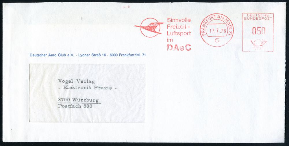 245 | 12 € | 6 Frankfurt/M. Flughafen Rhein-Main : 6 FRANKFURT AM MAIN 71/ Sinnvolle/ Freizeiz-/ Luftsport/ im/ DAeC 1978 (17.7.) AFS (Kranich-Logo) Vordr-Bf: Deutscher Aero-Club (Dü.E-26) | ![]() | |