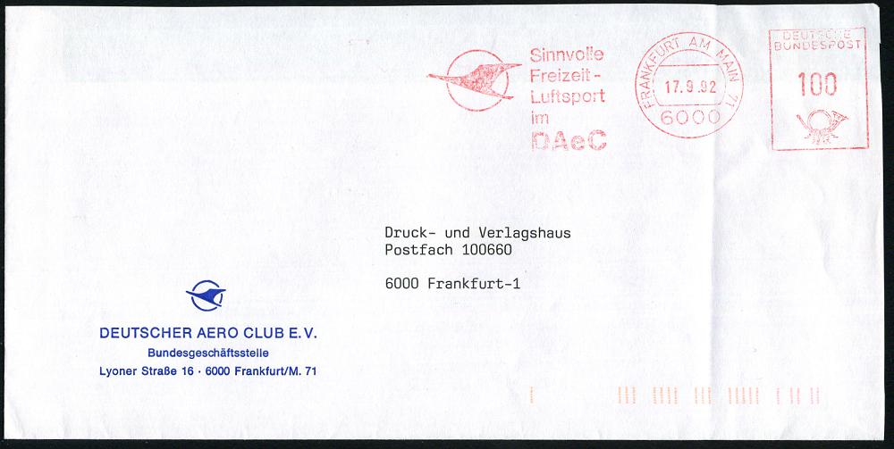 255 | 12 € | 6 Frankfurt/M. Flughafen Rhein-Main : 6000 FRANKFURT AM MAIN 71/ Sinnvolle/ Freizeit-/ Luftsport/ im/ DAeC 1992 (17.9.) AFS mit vierstelliger PLZ = Kranich-Logo , motivgl. Vordr-Bf: Deutscher Aero-Club (Dü.E-26) | ![]() | |