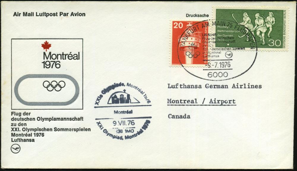 239 | 12 € | 6 Frankfurt/M. Flughafen Rhein-Main : 6000 FRANKFURT AM MAIN 75 FLUGHAFEN/ LH 5448/ Flug der deutschen/ Olympiamannschaft/ zu den/ XXI.Olymp. Spielen.. 1976 (9.7.) SSt a. 30 Pf. Feldhockey etc. + HdN: XXI Olympiad Montreal 1976.., Übersee-Sonderflug-SU. n. Montreal (Mi.521 u.a.) | ![]() | |