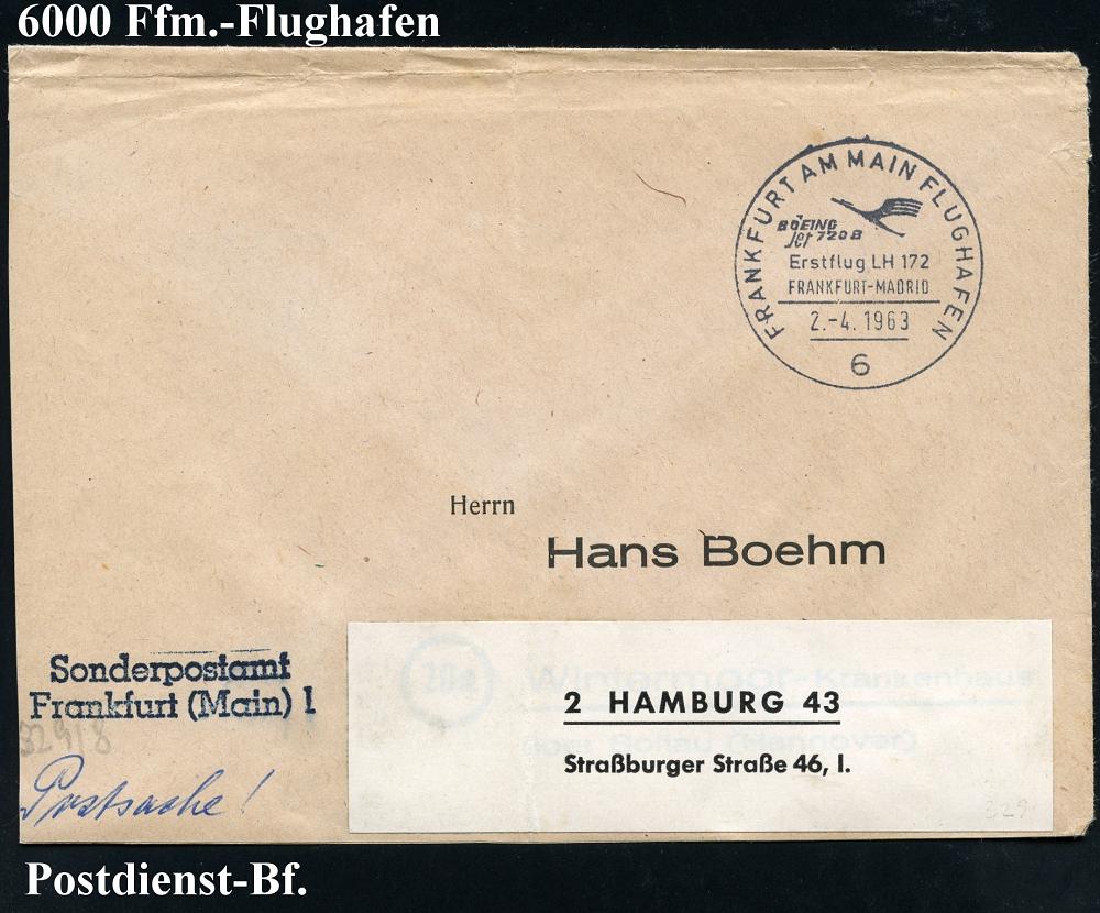 217 | 10 € | 6 Frankfurt/M. Flughafen Rhein-Main : 6 FRANKFURT AM MAIN FLUGHAFEN/ BOEING/ JET 720B/ Erstflug LH 172/ FRANKFURT-MADRID 1963 (2.4.) SSt (DLH-Logo) + bl. Abs.-2L: Sondepostamt/Frankfurt (Main) 1 , klar gest. (leicht verkürzter) Postdienst-Bf. (Bo.329) | ![]() | |