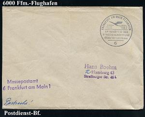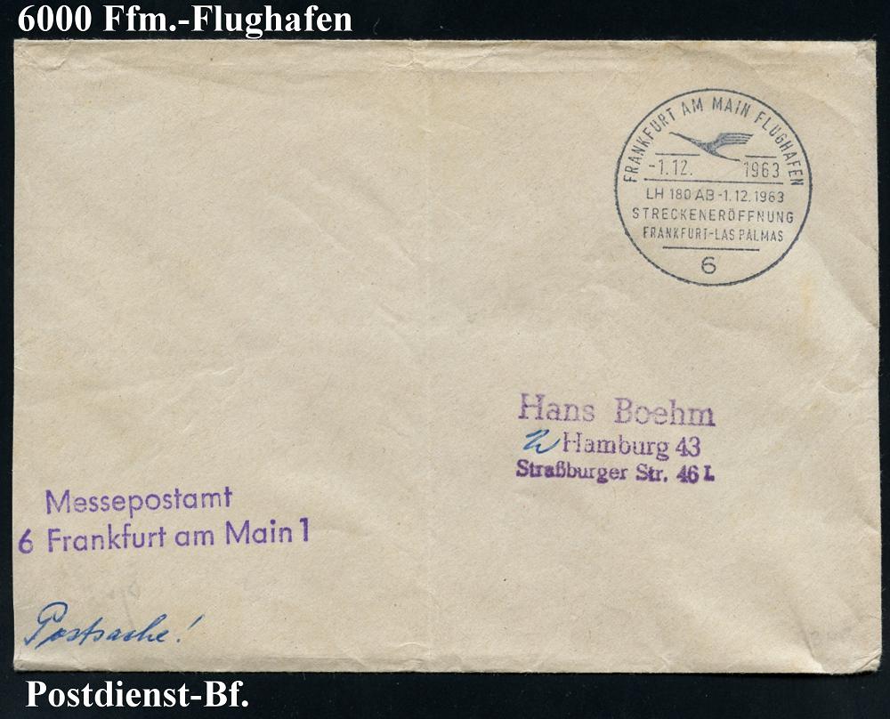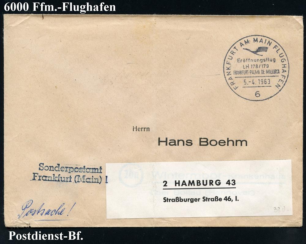 218 | 12 € | 6 Frankfurt/M. Flughafen Rhein-Main : 6 FRANKFURT AM MAIN FLUGHAFEN/ Eröffnungsflug/ LH 178-179/ FRANKFURT PALMA DE MALLORCA 1963 (5.4.) SSt (DLH-Logo) + bl. Abs.-2L: Sonderpostamt/Frankfurt (Main) 1 , klar gest. Postdienst-Bf. (Bo.330) | ![]() | |