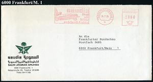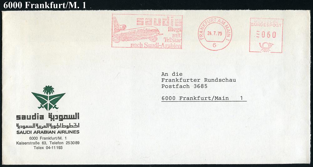 248 | 10 € | 6 Frankfurt/M. Flughafen Rhein-Main : 6 FRANKFURT AM MAIN 1/ saudia/ fliegt/ mit/ Tristar/ nach Saudi-Arabien 1979 (24.7.) AFS = Tristar-Jet , dekorativer, zweisprachiger Firmen-Bf. (Dü.E-26E) | ![]() | |