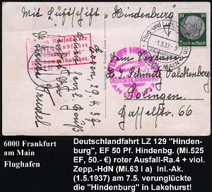 205 | 28 € | 6 Frankfurt/M. Flughafen Rhein-Main : FRANKFURT/ (MAIN)/ f/ Flug-u.Luftschiffhafen/ RHEIN-MAIN 1937 (1.5.) HWSt (Mi.A-5 f) auf EF 50 Pf. Hindenbg. (Mi. 525 ,EF + 50.- EUR) + viol. Zepp.-HdN.: LUFTSCHIFF HINDENBURG/DEUTSCHLAN FAHRT/AM 1. MAI 1937 (Luftschiff) + roter Ausfall-HdN: Wegen Ausfalls der/Deutschlandfahrt/ Postabwurf bei/Nordamerikafahrt (= LZ 129) Zepp.-Kt. n.Solingen, das Luftschiff wurde eine Woche später in Lakehurst vernichtet (Mi.63 I a) | ![]() | |