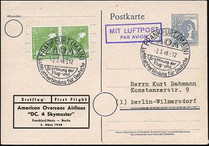 208 | 25 € | 6 Frankfurt/M. Flughafen Rhein-Main : FRANKFURT (MAIN)/ AOA/ Eröffnung d./ Flug-u./ Luftfrachtverbindung für Deutsche 1948 (2.3.) seltener SSt (Bo.111) 2x auf amtl. P 12 Arbeiter + Zudruck: Erstflug/ American Overseas Airlines/"DC 4 Skymaster"/ Frankfurt-Main - Berlin, selten! (ME. unbekannt!) | ![]() | |