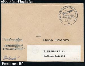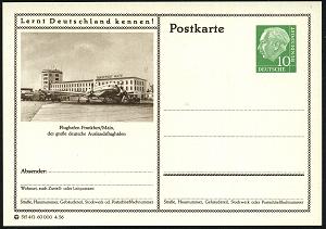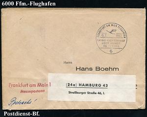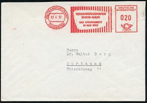 210 | 16 € | 6 Frankfurt/M. Flughafen Rhein-Main : (16) FRANKFURT (MAIN)/ FLUGHAFEN/ VERKEHRSFLUGHAFEN/ RHEN-MAIN.. 1957 (17.4.) AFS = Hauspostamt Flughafen , rs. Abs.-Vordruck: WALTER LUZ.. FLUGHAFEN, Fern-Bf. (Dü.E-23CO) | ![]() ![]() | |