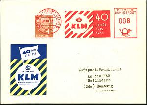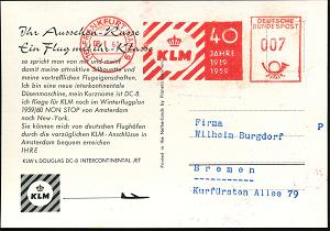 213 | 18 € | 6 Frankfurt/M. Flughafen Rhein-Main : (16) FRANKFURT (MAIN) 9/ KLM/ 40/ JAHRE/ 1919-/ 1959 1959 (8.1.) seltener Jubil.-AFS (KLM-Logo) auf Color-Reklame-Ak.: KLM (DC-8) n. Bremen (Dü.E-23CO) | ![]() ![]() | |