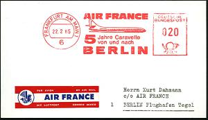 225 | 15 € | 6 Frankfurt/M. Flughafen Rhein-Main : 6 FRANKFURT AM MAIN 1/ AIR FRANCE/ 5 Jahre Caravelle/ von u.nach/ BERLIN 1965 (22.2.) Jubil.-AFS (= "Caravelle"-Jet = S.E. 210) + Air France-Label, Inl.-Flp.-Kt. (Dü.E-23CO) | ![]() | |