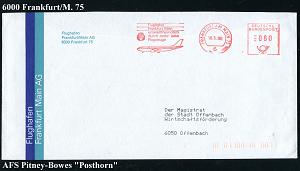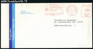 249 | 18 € | 6 Frankfurt/M. Flughafen Rhein-Main : 6 FRANKFURT AM MAIN 75 FLUGHAFEN/ Flughafen/ ..umweltfreundlich/ durch mehr leise/ Flugzeuge 1980/88 2 verschied. AFS Francotyp bzw. Pitney Bowes = je Airbus (u. Logo) 2 dekorat., zweifarbiger Firmen-Briefe, Einzelverkauf möglich: je 10.- EUR (Dü.E-26E) | ![]() ![]() ![]() | |