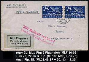 258 | 45 € | 6 Frankfurt/M. Flughafen Rhein-Main : SCHWEIZ 1930 (1.8.) roter 2L: Mit Luftpost befördert/Frankfurt (Main) 2 Flughafen (Mi.F-36-08,+ 25.- EUR) schweizer Frankatur 2x 25 C. Flp. + 1K: ZÜRICH FLUGHAFEN/LUFTPOST (Mi.26.49 + 30.- EUR) + hellblauer LPZ, n. Kassel (Mi.180 MeF, + 35.- EUR, insges. 85.- EUR) | ![]() | |