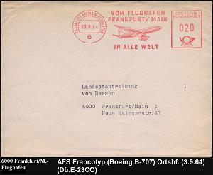 223 | 12 € | 6 Frankfurt/M. Flughafen Rhein-Main : 6 FRANKFURT AM MAIN-FLUGHAFEN/ VOM FLUGHAFEN../ IN ALLE WELT 1964 AFS (Boeing B 707) klar gest. .Orts-Bf. | ![]() | |