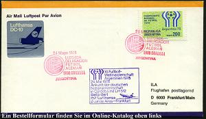 257 | 10 € | 6 Frankfurt/M. Flughafen Rhein-Main : ARGENTINIEN 1978 (24.5.) Lufthansa-WM-Sonderflug: Buenos Aires - Frankfurt/M., EF 200 P. WM , viol. DLH-Flug-WM-HdN + roter WM-SSt: CORDOBA, Transatlantik-Sonderflug-Bf. (Mi.1323 EF) | ![]() | |