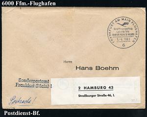 219 | 12 € | 6 Frankfurt/M. Flughafen Rhein-Main : 6 FRANKFURT AM MAIN FLUGHAFEN/ LH 648 NACH FERNOST/ ÜBER KUWEIT.. 1963 (5.7.) SSt (DLH-Logo) + roter Abs.-2L: Frankfurt am Main 1/Messepostamt , klar gest. Postdienst-Bf. (Bo.327) | ![]() | |
