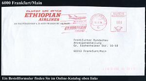 256 | 15 € | 6 Frankfurt/M. Flughafen Rhein-Main : 6 FRANKFURT AM MAIN 16/ Mit Boeing 767../ ETHIOPIAN/ AIRLINES 1994 (10.8.) seltener, sehr später AFS "Postalia" mit alter einstelliger PLZ (Jet) zweifarbiger Firmen-Orts-Bf., ab 1993 gab es neue fünfstellige PLZ ! (Dü.E-26B) | ![]() | |