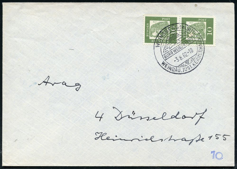 4189 | 12 € | POSTLEITRAUM 7100 (OHNE HEILBRONN u. LUDWIGSBURG) : WEINSBERG (WÜRTT)/ BURG WEIBERTREU/ WEINBAU,JUST.KERNERHAUS 1962 (3.8.) aptierter HWSt = alte PLZ entfernt (Burg Weibertreu, Traube) klar gest. Fernbf.! mit neuer PLZ (Mi.350 MeF) | ![]() | |