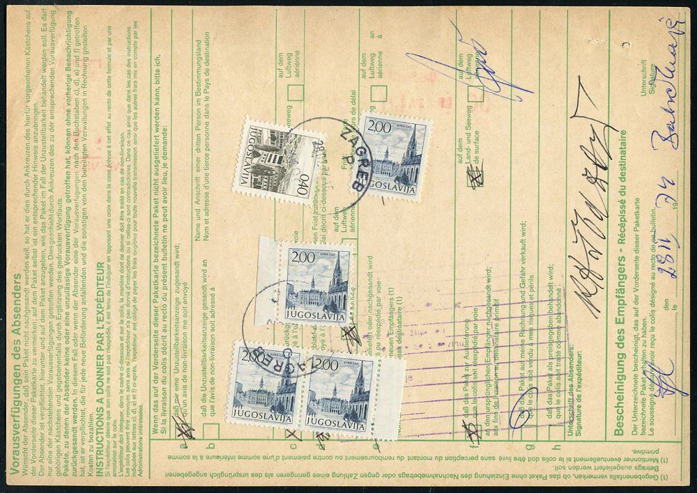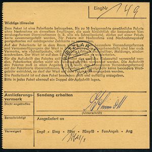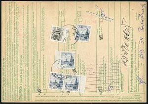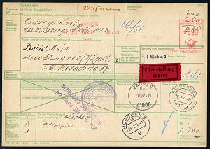 4193 | 20 € | POSTLEITRAUM 7100 (OHNE HEILBRONN u. LUDWIGSBURG) : = pa = WEINSBERG 1974 (20.2.) Paket-PFS Francotyp "Posthorn" *890 (Pf.) + brauner Paketzettel: 7102 Weinsberg + 1K: 7102 WEINSBERG 1/a, klar gest. Eil-Ausl.-Paketkt. n.Zagreb!, seltenes Porto! (Dü.H-6A = seltene Type!) | ![]() ![]() | |
