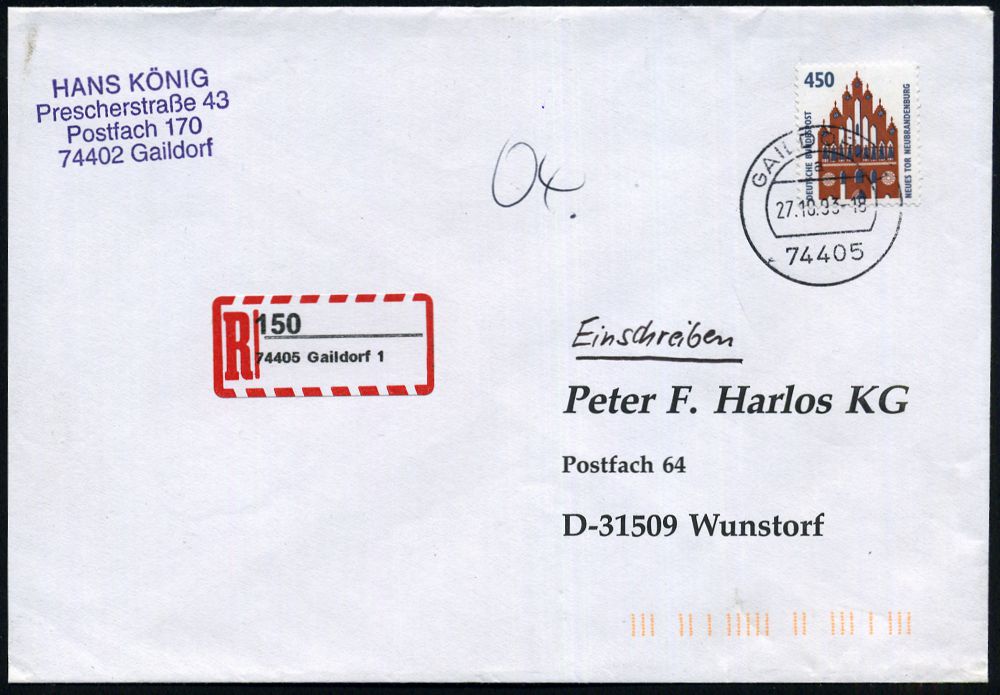 4032 | 15 € | POSTLEITRAUM 7100 (OHNE HEILBRONN u. LUDWIGSBURG) : 74405 GAILDORF 1/ a 1993 (27.10.) 1K-Segment auf EF 450 Pf. Neubrandenbg. + Selbstklebe-RZ: 74405 Gaildorf 1 , hatte nur kurze Verweundungszeit!, Inl.-R-Bf. (Mi.1623 EF + 10.- EUR) | ![]() | |