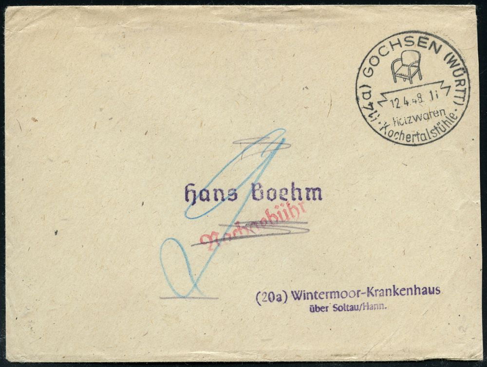 4035 | 14 € | POSTLEITRAUM 7100 (OHNE HEILBRONN u. LUDWIGSBURG) : (14a) GOCHSEN (WÜRTT)/ Holzwaren/ Kochertalstühle 1948 (12.4.) HWSt (Lehnstuhl) + roter 1L: Nachgebühr (gestrichen) klar gest. (gefalteter) Postdienst-Antwort-Bf. (Bo.2) | ![]() | |