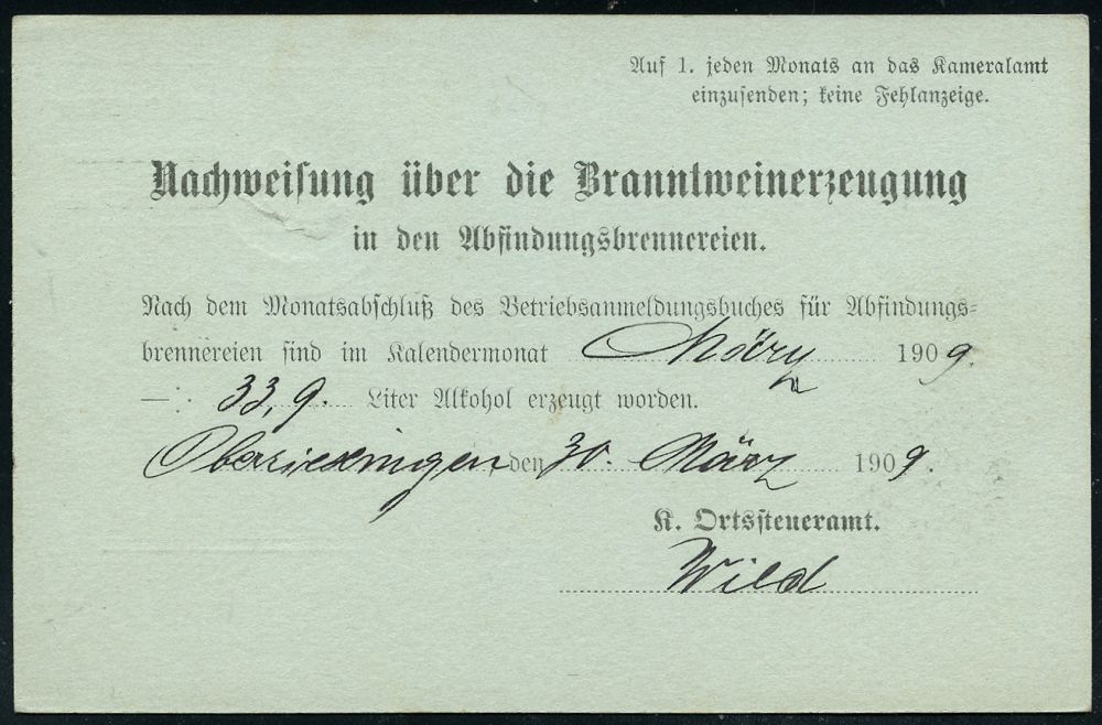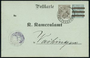 4036 | 35 € | POSTLEITRAUM 7100 (OHNE HEILBRONN u. LUDWIGSBURG) : GROSSSACHSENHEIM 1909 (29.3.) 1K auf Dienst-P 3Pf./2 Pf. Ziffer, Provisorium + rs.Zudruck: Nachweisung über die Branntwein-erzeugung in der Abfindungsbrennereien n. Vaihinggen, selten! (Mi.DPB 2 b) | ![]() ![]() | |