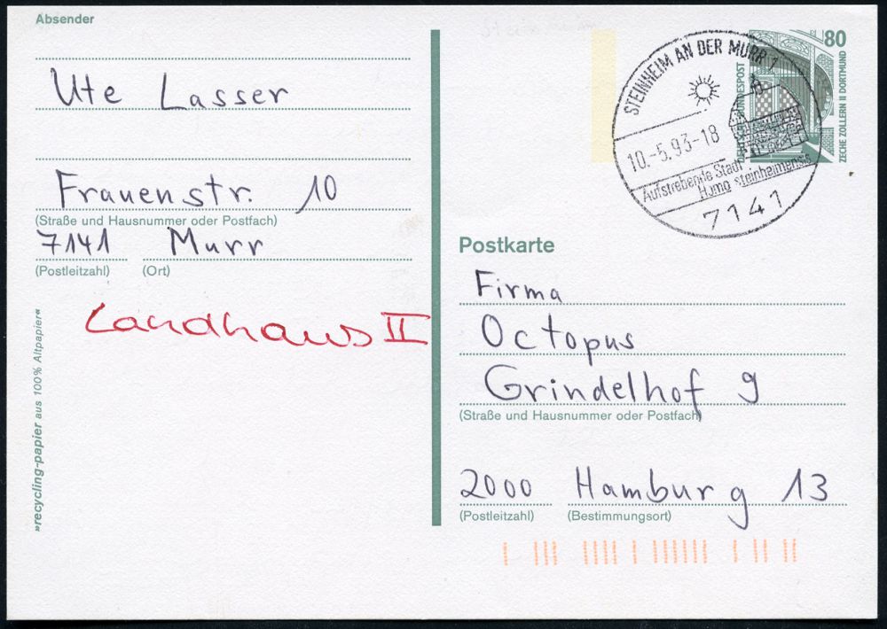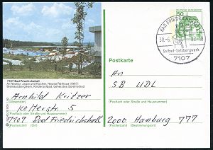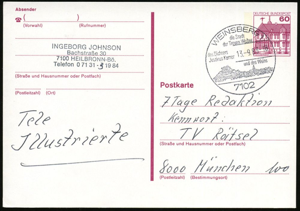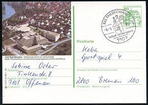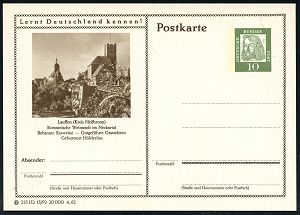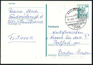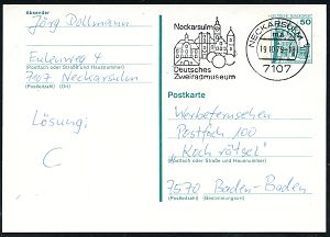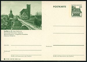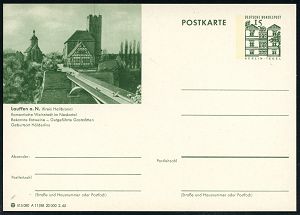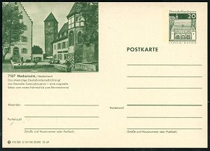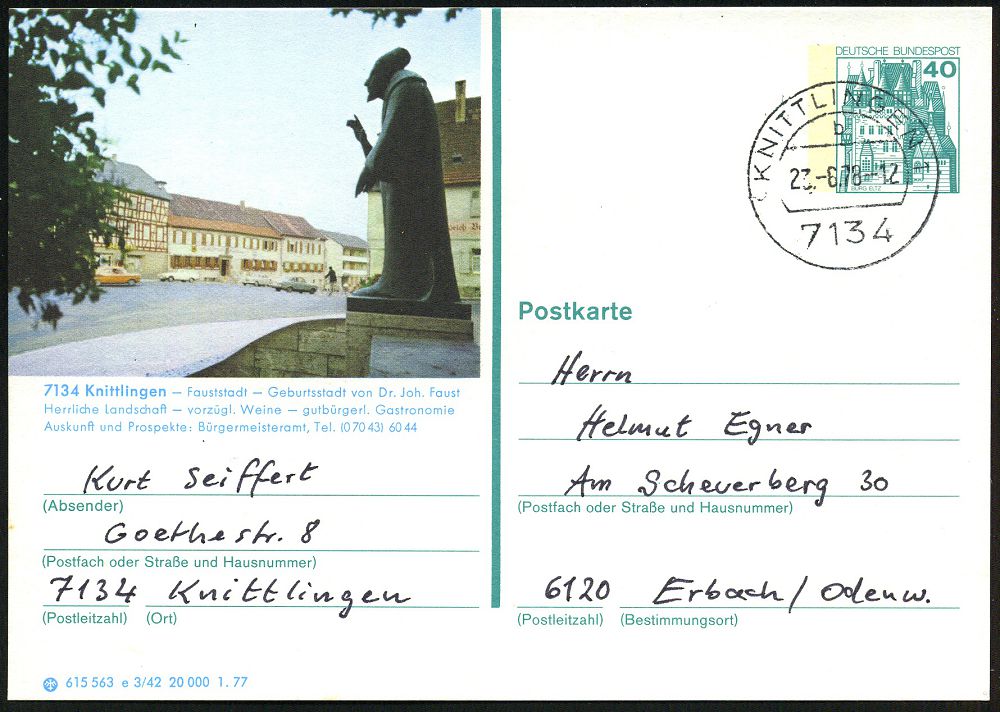 4046 | 12 € | POSTLEITRAUM 7100 (OHNE HEILBRONN u. LUDWIGSBURG) : 7134 KNITTLINGEN 1/ b 1978 (23.6.) 1K-Segment auf ortsgl. BiP 40 Pf. Burgen, blaugrün: 7134 Knittlingen - Fausstadt.. = Dr. Faust-Denkmal , Inl.-Karte, seltene Kombination! (Mi.P 124-e32/42) | ![]() | |