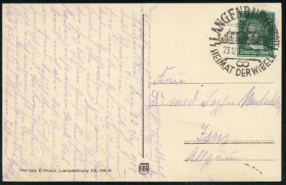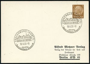 4056 | 18 € | POSTLEITRAUM 7100 (OHNE HEILBRONN u. LUDWIGSBURG) : LANGENBURG (WÜRTT)/ Heimat der Wibele/ ..Agnes Günthers Brauneck 1937 (18.6.) HWSt (Schloß) auf PP 3 Pf. Hindenbg., braun: A. Metzner Verlag.. (Mi.PP 122/B 9) glasklar gest. (Bo.2, Erstjahr) | ![]() | |