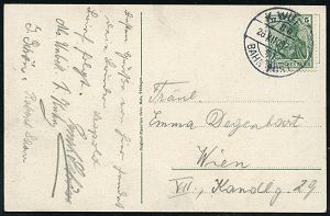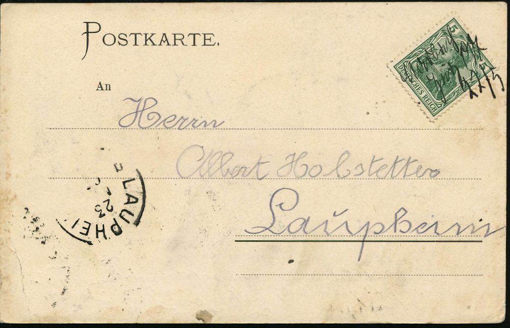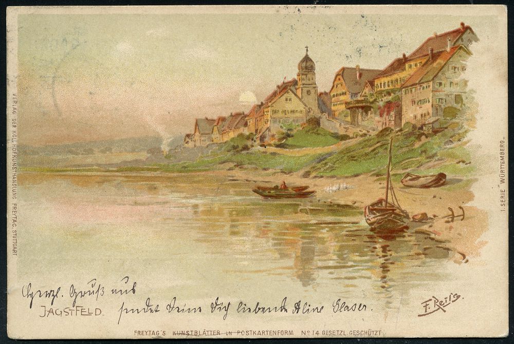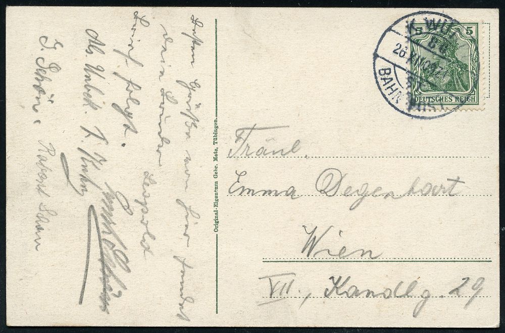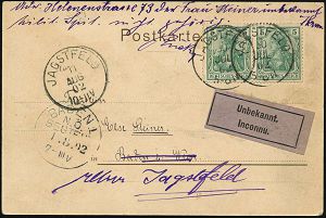 4041 | 20 € | POSTLEITRAUM 7100 (OHNE HEILBRONN u. LUDWIGSBURG) : JAGSTFELD 1902 (11.8.) 1K auf Color-Litho-Ak.: JAGSTFELD (Künstlerkt. sign. F.Reisz) n.Österreich, lila Klebezettel: Unbekannt.. (Baden b.Wien) Retour-Kt. (Mi.70 MeF) | ![]() ![]() | |