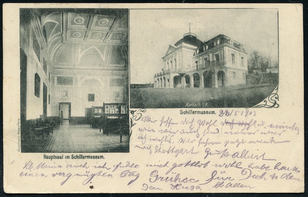 4117 | 20 € | POSTLEITRAUM 7100 (OHNE HEILBRONN u. LUDWIGSBURG) : Marbach/ Neckar 1903 (22.3.) 5 Pf. Germania mit ungewöhnlicher, handschriftlicher Entwertung: "M a r b a c h.." , s/w.-Foto-Ak.: Schiller-Museum (2 Bilder) n. Laupheim (Mi.69) | ![]() ![]() | |