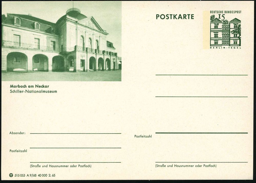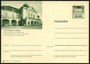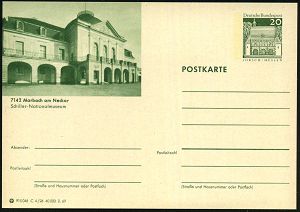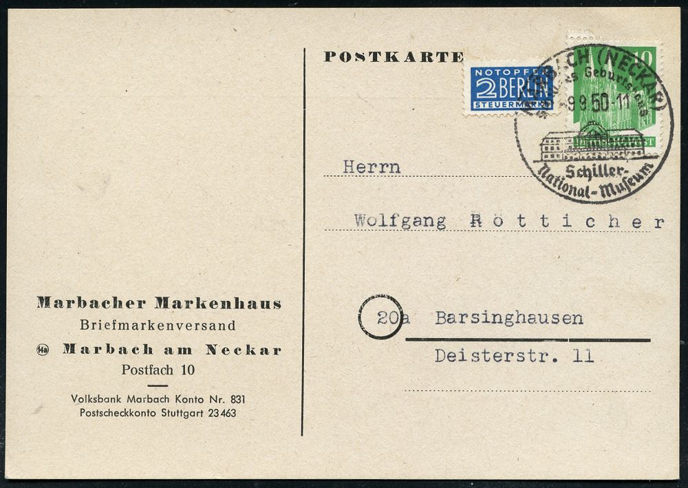 4120 | 12 € | POSTLEITRAUM 7100 (OHNE HEILBRONN u. LUDWIGSBURG) : MARBACH (NECKAR)/ Schillers Geburtshaus/ Schiller-/ National-Museum 1950 (9.9.) HWSt (Schiller-Nationalmuseum) auf Bauten-Frankatur, Firmenkt.: Marbacher Markenhaus .. (Bo.2) | ![]() | |