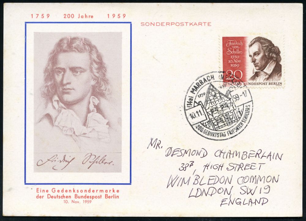 4121 | 16 € | POSTLEITRAUM 7100 (OHNE HEILBRONN u. LUDWIGSBURG) : (14a) MARBACH (NECKAR)/ 200.GEBURTSTAG FRIEDR.SCHILLERS 1959 (10.11.) SSt = Schillerhaus auf EF 20 Pf. F.Schiller (Bln Mi.190 EF), Jubil.-Ersttags-Gedenkblatt als Ausl.-Karte (Bo.6) | ![]() | |