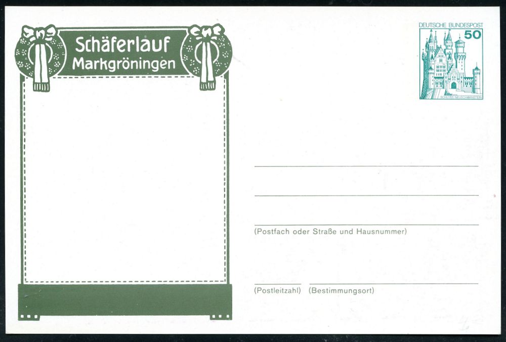 4126 | 10 € | POSTLEITRAUM 7100 (OHNE HEILBRONN u. LUDWIGSBURG) : Markgröningen 1979 PP 50 Pf. Burgen, grün: Volksfest "Schäferlauf" (histor.Schäferlauf, Reiter, Schafe, Trachten, Orchester) ungebr. | ![]() ![]() | |