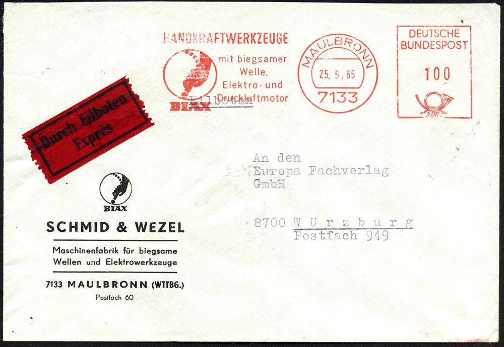 4128 | 16 € | POSTLEITRAUM 7100 (OHNE HEILBRONN u. LUDWIGSBURG) : 7133 MAULBRONN/ HANDKRAFTWERKZEUGE/ ..BIAX 1965 (25.5.) AFS Postalia 100 Pf. = Hand mit biegsamer Welle, motivgl. Firmen-Eil-Fern-Bf.: SCHMID & WEZEL.. n. Würzburg, seltenes Motiv! (Dü.E-26B) | ![]() | |