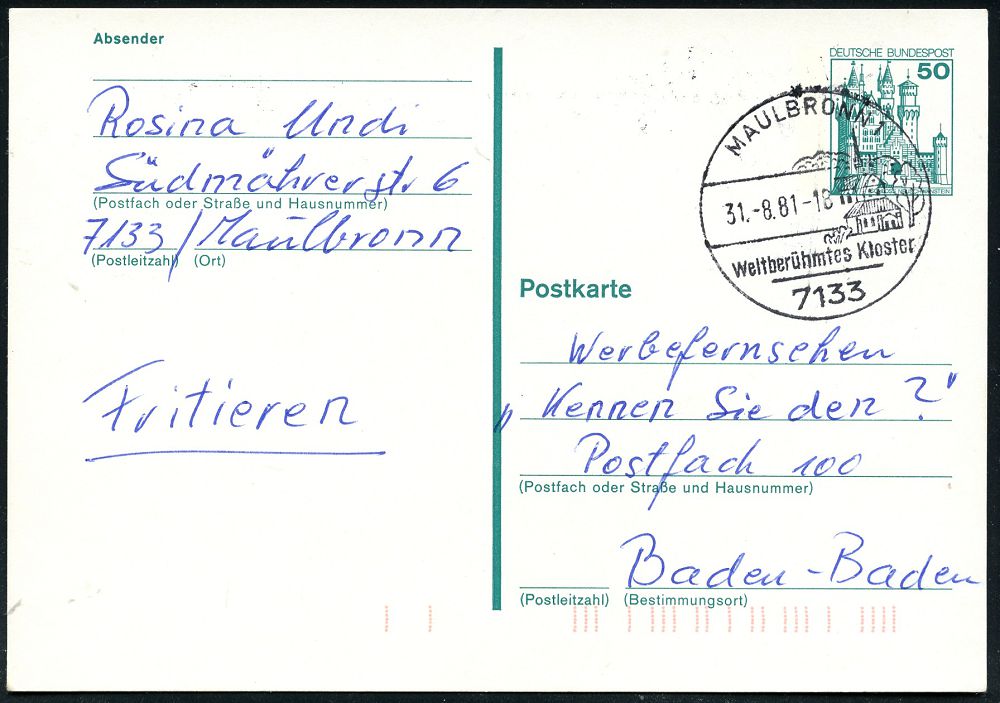 4129 | 5 € | POSTLEITRAUM 7100 (OHNE HEILBRONN u. LUDWIGSBURG) : 7133 MAULBRONN 1/ Weltberühmtes Kloster 1981 (31.8.) HWSt (Klosterkirche) = Wirkungsstätte Hölderlins u. H. Hesses, Bedarf (Bo.6) | ![]() | |