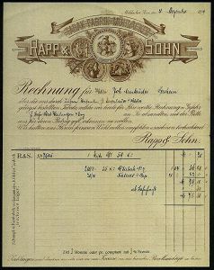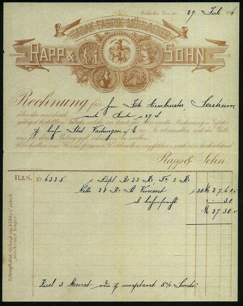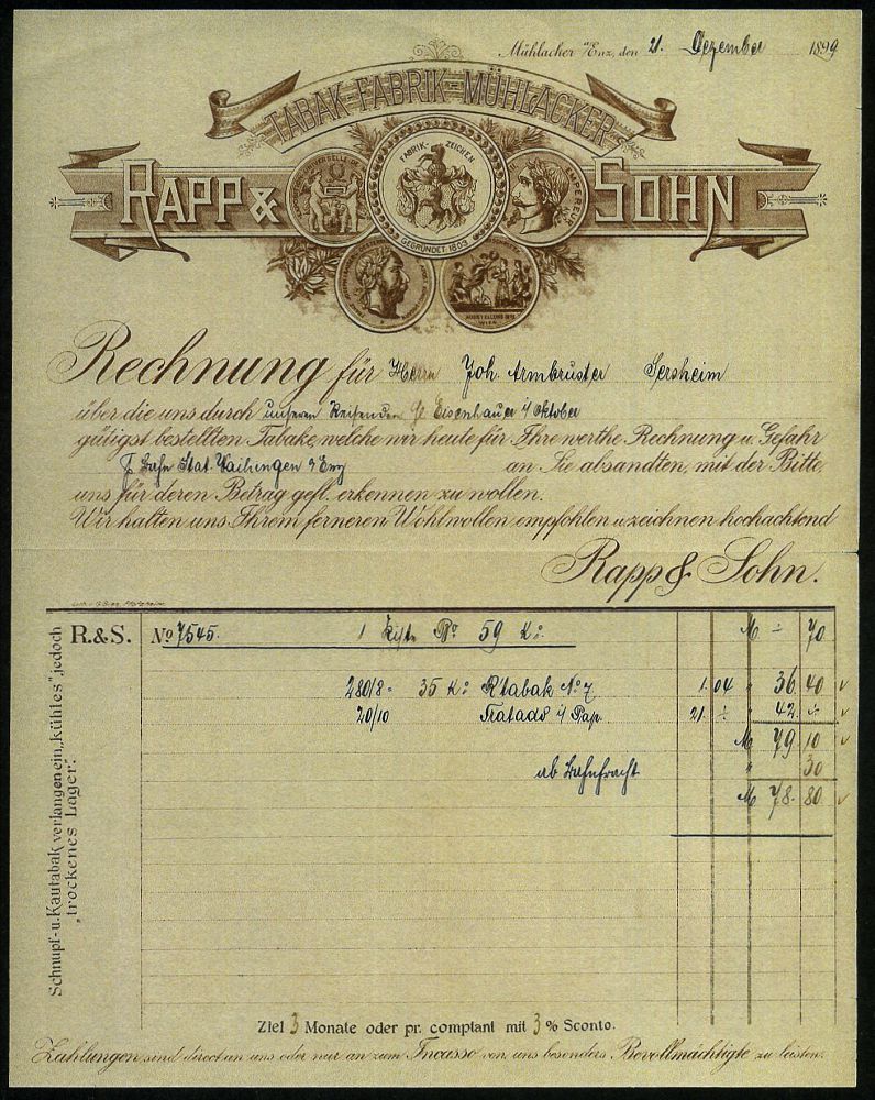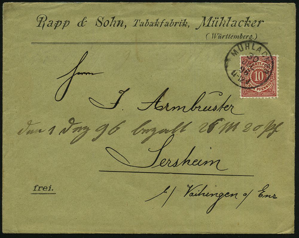 4131 | 28 € | POSTLEITRAUM 7100 (OHNE HEILBRONN u. LUDWIGSBURG) : MÜHLACKER 1896 (30.7.) 1K auf Firmen-Bf.: Rapp & Sohn, Tabakfabrik + Inhalt: dekorative, illustrierte Firmen-Rechnung (Medaillen der Expo Paris, 1889 mit Napoeon III. u.a.) 2 Belege komplett (Mi.46 b, EF Württembg.) | ![]() ![]() | |